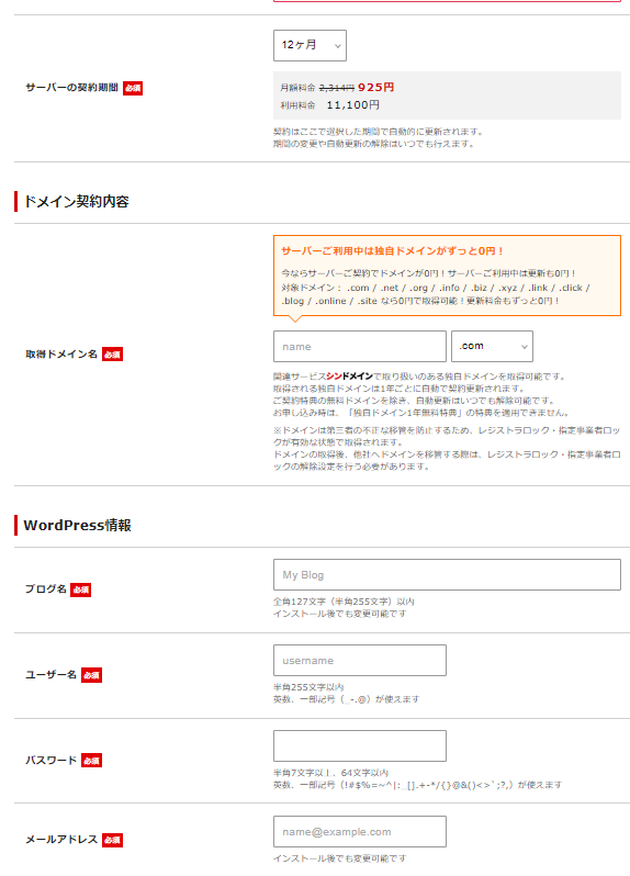 画面を下にスクロールすると、契約期間とドメイン設定の項目が表示されます。