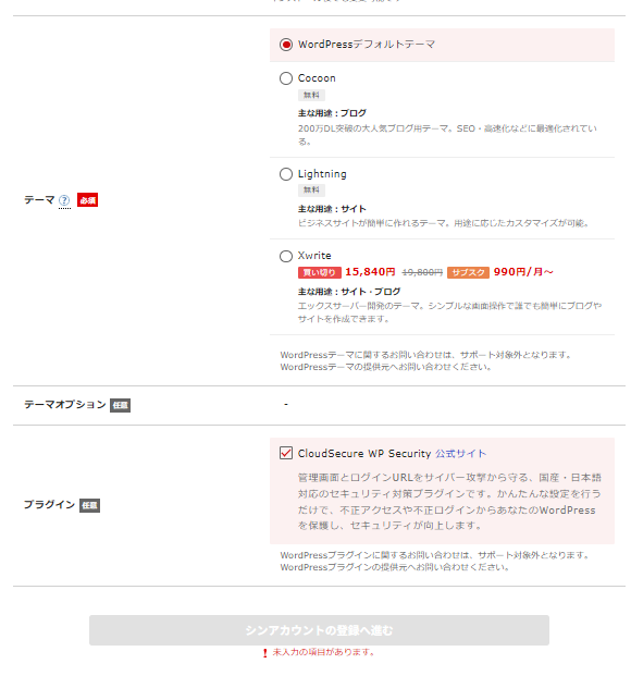 プラグインは「CloudSecure WP Security」にチェックを入れておきましょう。サイバー攻撃から守る国産セキュリティプラグインで、WordPressを安全に保護してくれます。