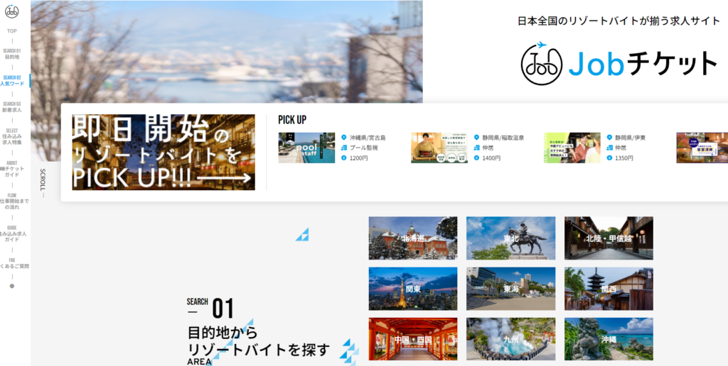 リゾートバイト-Jobチケットは、リゾート地で働きながら生活費を抑えてしっかり稼ぎたい人に向いているリゾート派遣サービスです。