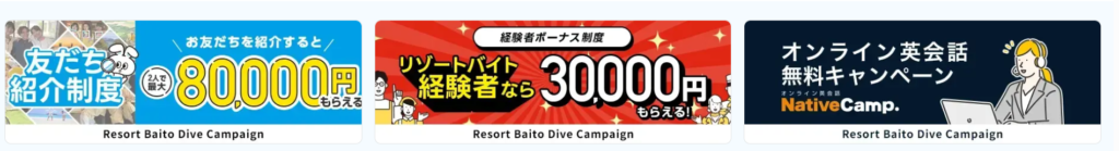 すでに他社でリゾートバイト経験がある人は、ダイブ(Dive)への登録でボーナス対象になる場合があります。