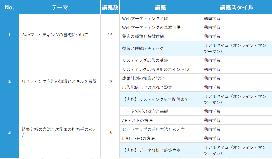 | 学べる内容 | SEO対策 広告運用 コンテンツマーケ | 広告運用 効果分析 プランニング | Web広告 SNS運用 LPO SEO基礎 | SEO 広告運用 データ分析 戦略立案 | 広告運用 戦略設計 市場分析 | SEO 集客 メディア運営 | Web広告 アクセス解析 プランニング | 広告運用 解析 Web改善 | SEO 広告 SNS デザイン | 広告運用 分析 戦略設計 | SNSマーケ TikTok YouTube | SNSマーケ コンテンツ制作 運用戦略 | SEO 広告 SNS LP制作 | Webマーケ デザイン複合 | Instagram LINE SNSマーケ |